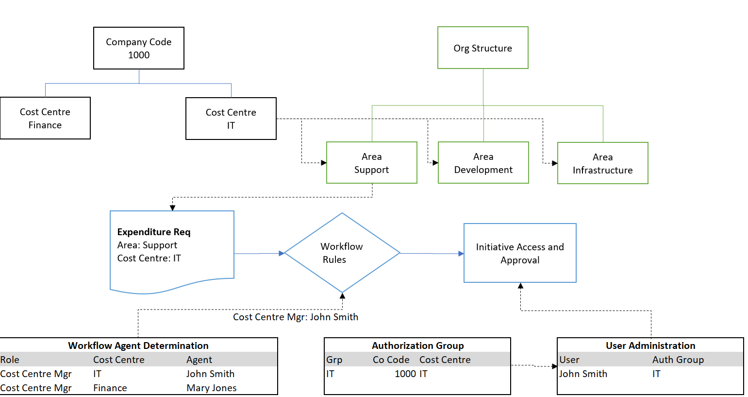 For example, the Information Technology department may be defined as a Cost Centre. A number of areas in the Organizational Structure may be associated with the Information Technology department (e.g. Support, New Projects, and Infrastructure). When specifying workflow routing rules, there may be a requirement for all Cost Centre Managers to approve initiatives. In Stratex Online, this can be achieved by assigning the Role of Cost Centre Manager to John Smith, the IT manager. When an initiative is submitted for a benefiting area linked to the Information Technology Cost Centre, John Smith will be derived as the approver. Authorization groups can be defined by Cost Centre. This can ensure that the Cost Centre manager can view all initiatives related to areas linked to their Cost Centers.