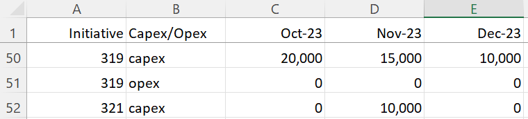 Update forecast by Initiative ID, CapEx/OpEx, and Month (column) in the spreadsheet, and click Upload in Stratex to update actual accordingly.