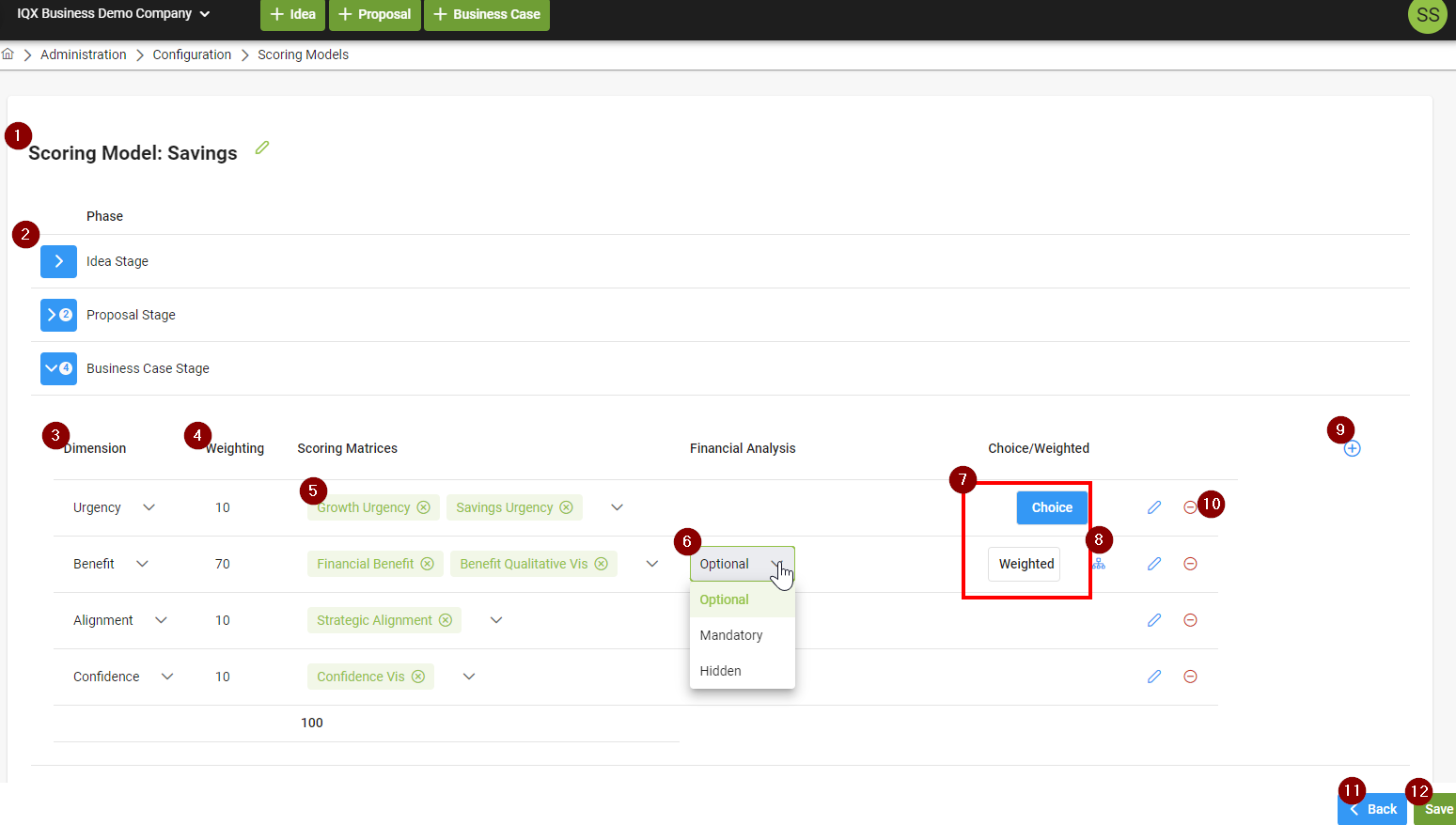 Weighting matrices - Used to change the weighting of scoring matrices in a dimension to determine their relative importance to each other. The total must always add up to 100.