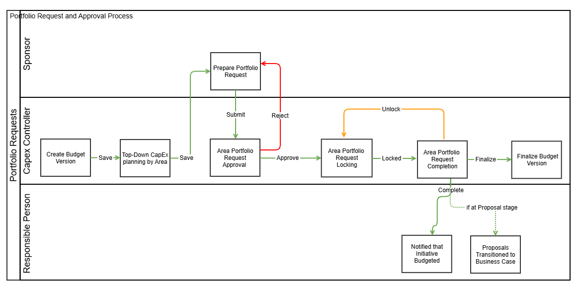 The capital controller will approve or reject individual area/group portfolio requests, while area managers and sponsors can only review area portfolio requests, both with reference to planned top-down capital allocations. Once all area capital allocations are approved, the budget version is completed, and all initiatives are updated with the budgeted amount. If an initiative is at the Proposal Stage, it will automatically be transitioned to the Business Case stage on budget version completion.